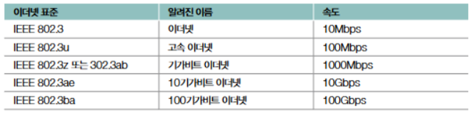 - 이더넷 표준이 달라지면 통신 매체의 종류를 비롯한 신호 송수신 방법, 나아가 최대 지원 속도가 달라질 수 있다.