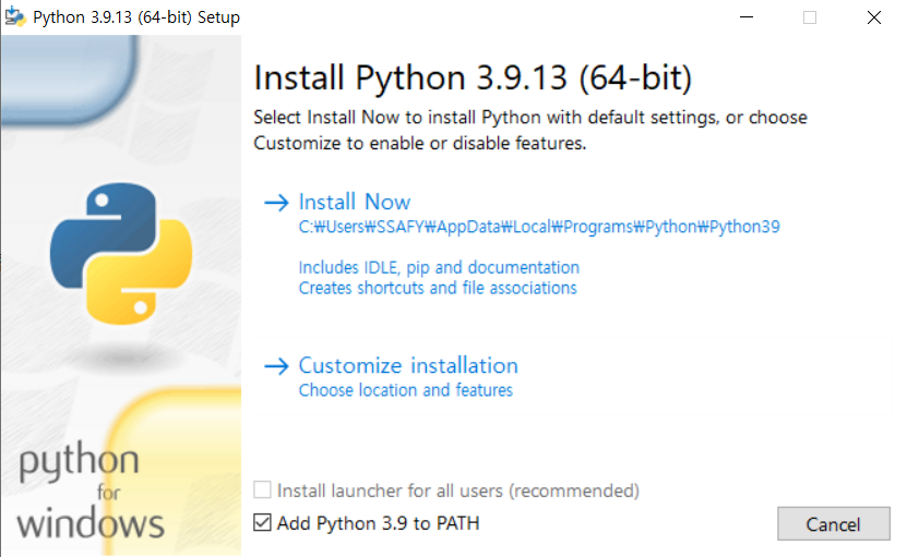 Add python 3.9 to PATH에 체크하고 Install Now를 클릭한다.