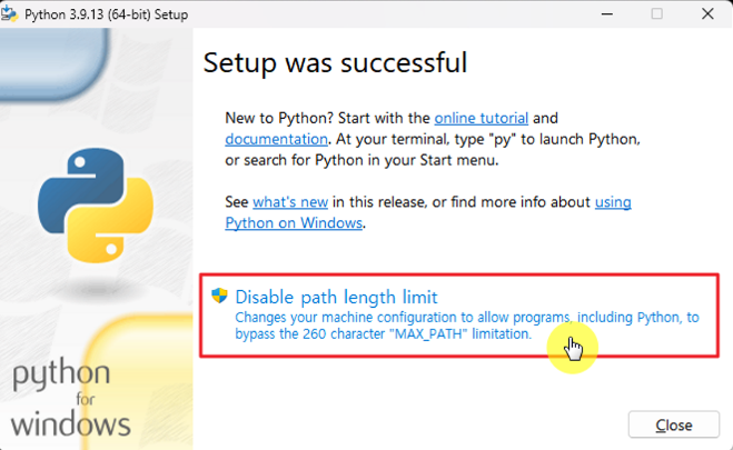 설치완료후 Disable path length limit을 클릭하고 설치를 종료한다.