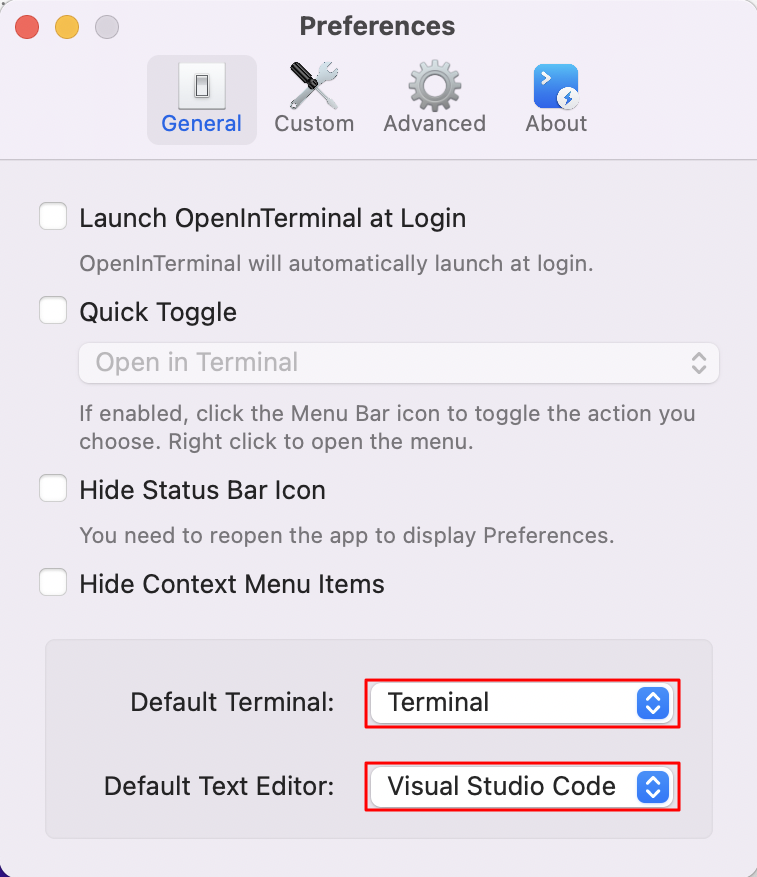 Default Terminal을 Terminal로, Default Text Editor를 Visual Studio Code로 설정합니다.