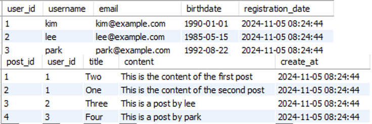 - LEFT JOIN : 왼쪽 테이블을 기준으로 오른쪽 테이블의 레코드를 합치고, 없다면 NULL값을 준다.