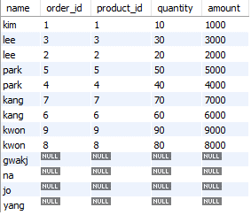 - FULL JOIN : 두 테이블의 모든 레코드를 선택한다. 대응되지 않으면 NULL값을 준다.
