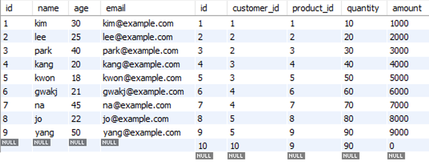 - RIGHT JOIN : 오른쪽 테이블을 기준으로 왼쪽 테이블의 레코드를 합치고, 없다면 NULL값을 준다.